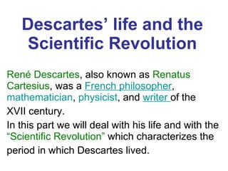 - René Descartes was a French philosopher, mathematician, physicist, and writer who lived during the Scientific Revolution in the 17th century. He made important contributions to both mathematics and philosophy.