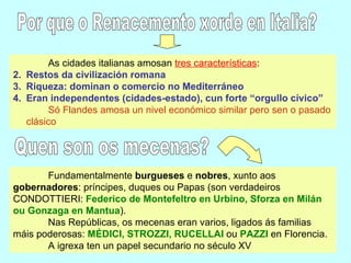 Por que oRenacemento xorde en Italia? Quen son os mecenas? As cidades italianas amosan tres características : Restos da civilización romana Riqueza: dominan o comercio no Mediterráneo Eran independentes (cidades-estado), cun forte “orgullo cívico” Só Flandes amosa un nivel económico similar pero sen o pasado clásico Fundamentalmente burgueses e nobres , xunto aos gobernadores : príncipes, duques ou Papas (son verdadeiros CONDOTTIERI: Federico de Montefeltro en Urbino, Sforza en Milán ou Gonzaga en Mantua ). Nas Repúblicas, os mecenas eran varios, ligados ás familias máis poderosas: MÉDICI, STROZZI, RUCELLAI ou PAZZI en Florencia. A igrexa ten un papel secundario no século XV