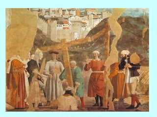 PIERO DELLA FRANCESCA. Lenda da verdadeira cruz 1452-66. O soño de Constantino Arezzo. Pintura ao fresco ELEMENTOS DESTACADOS DE PIERO : O USO DA PERSPECTIVA PARA CREAR ESPAZOS PICTÓRICOS MONUMENTALIDADE DAS FIGURAS XEOMETRIZACIÓN DAS FORMAS (todo como variacións de esferas, conos, cilindros, cubos, pirámides...)