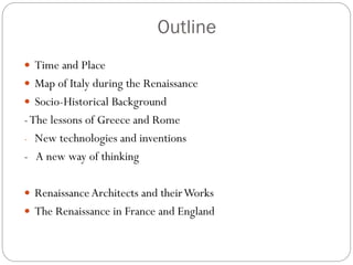 The document provides an overview of Renaissance architecture, beginning with its origins in 14th century Florence and spread across Europe until the 17th century. It discusses key socio-historical developments like the rediscovery of classical Greek and Roman texts, as well as technological innovations. Figures like Brunelleschi, Alberti, and Palladio are highlighted for their contributions, with brief descriptions of works like Brunelleschi's dome for Florence Cathedral. Characteristics of Renaissance architecture are outlined, such as emphasis on symmetry, proportion, and classical orders of columns. The document provides context around the emergence of Renaissance architecture from the late Middle Ages.
