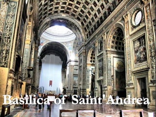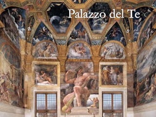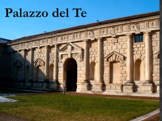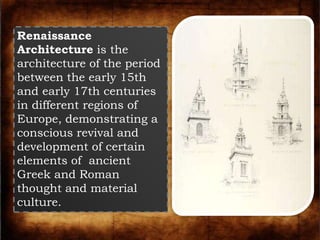 The Renaissance architecture style originated in 15th century Italy and was inspired by ancient Greek and Roman architecture. It emphasized symmetry, proportion, geometry and classical orders. Early architects like Brunelleschi and Alberti helped establish Renaissance styles which emphasized order and classical details. During the High Renaissance, architects like Bramante and Raphael further developed classical concepts. Mannerism introduced more imaginative rhythms as the Renaissance ideal of harmony gave way. The Renaissance style then spread across Europe in the 16th century as other regions gained economic and political power.