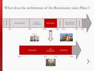 The Renaissance architecture began in Italy in the 15th century as a cultural revolution that substituted Gothic architecture and returned to designs of antiquity. Architects during the Renaissance became more intellectual and scientific in their designs, studying geometry, perspective, and architectural languages. Two influential Renaissance architects were Filippo Brunelleschi, who designed the dome of Florence Cathedral, and Leon Battista Alberti, who designed Tempio Malatestiano. Renaissance architecture then spread across Europe, influencing designs of castles, palaces, and cathedrals in other countries like France, Hungary, Belgium, and Germany.
