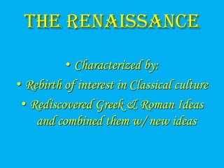 The Renaissance was characterized by a rebirth of interest in classical culture and Greek and Roman ideas. Art forms that emerged during this period included sculptures like Michelangelo's David, murals like his work in the Sistine Chapel, drawings by Da Vinci, and paintings such as Botticelli's Birth of Venus. These works featured realistic depictions of people and nature, with perfect bodies, active movement, and accurate use of perspective and lighting.
