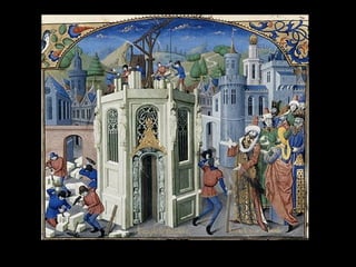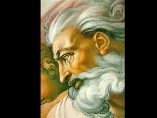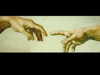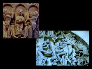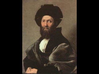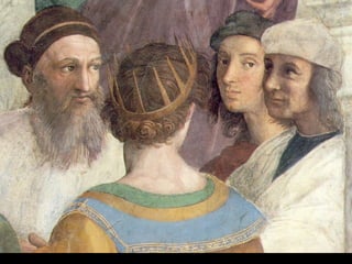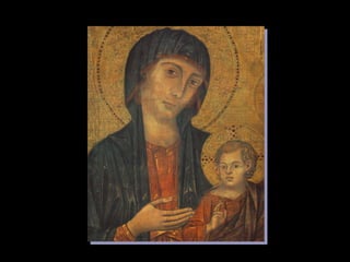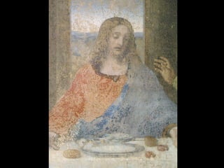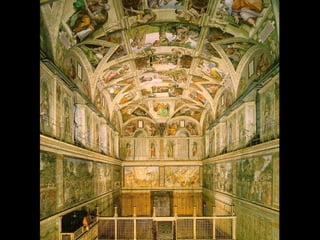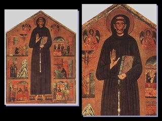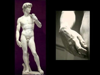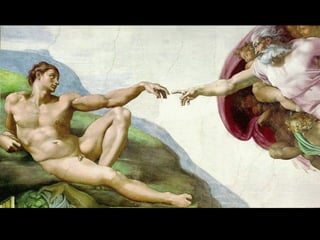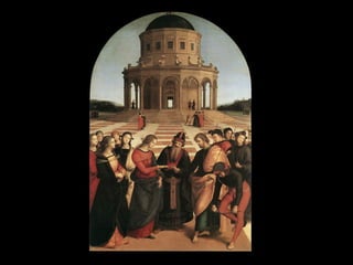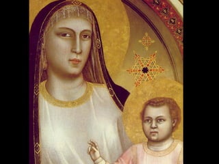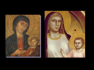 The document summarizes key differences between medieval and Renaissance art, including disproportionate figures with unrealistic faces in medieval art compared to more realistic proportions and perspective in Renaissance works. It provides examples of medieval art like Madonna Enthroned by Cimabue and transition works by Giotto that began incorporating 3D perspective. Examples of Renaissance art mentioned include Botticelli's Adoration of the Magi, Mantegna's Dead Christ, and works by Raphael, Da Vinci, and Michelangelo.