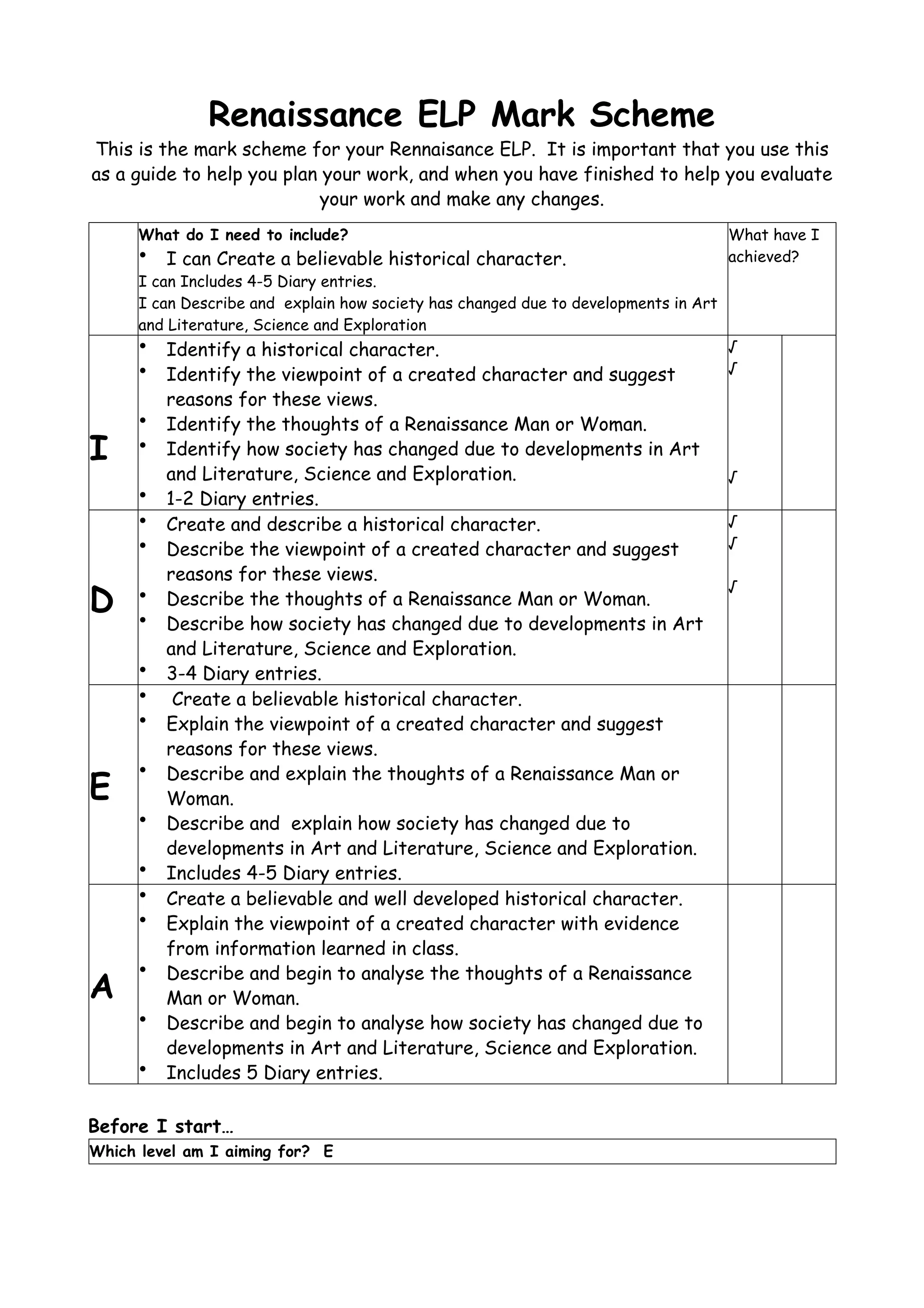 This document provides a mark scheme for a Renaissance ELP (Extended Learning Project). It outlines the requirements to achieve different levels from I to E. The highest level, E, requires students to create a believable historical character, explain their viewpoint with evidence, analyze the thoughts of Renaissance men/women, and analyze how society changed due to developments in art, literature, science and exploration. Students are also expected to include 4-5 diary entries from the perspective of their character. The document guides students to self-evaluate their work and determine what level they achieved.