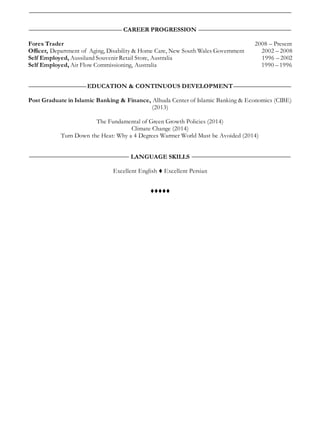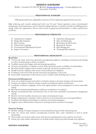 This document is a resume for Mohsen Albokord, an Australian national with over 24 years of experience in environmental management, retail operations, and financial trading. Albokord has strong skills in administrative support, operations management, sales and marketing, research and analysis, and training and development. His professional experience includes overseeing retail store operations, carrying out environmental impact assessments and awareness campaigns, and performing foreign exchange trading to maximize financial gains. Albokord holds post-graduate qualifications in Islamic banking and finance and has undertaken continuous development training in areas such as green growth policies and climate change.