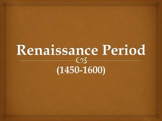 The Renaissance period (1450-1600), meaning 'rebirth', was marked by a renewed interest in ancient Greece and Rome, alongside significant voyages of discovery and scientific advances. Renaissance music is characterized by its polyphonic texture, emotional depth, and the integration of both sacred and secular forms, with prominent composers like Josquin des Prez and Giovanni Pierluigi da Palestrina. Music during this time transitioned from vocal dominance to a more balanced appreciation of instrumental pieces, and included choral polyphony and various secular genres such as madrigals and balletts.
