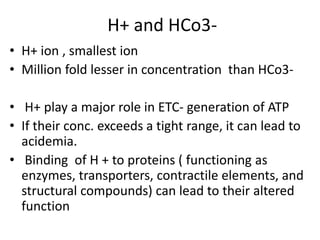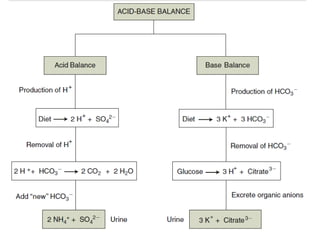 The kidneys play a major role in regulating pH levels in the body through net acid excretion. The kidneys reabsorb nearly all filtered bicarbonate and add new bicarbonate during acid loads by excreting ammonium. Proximal tubular absorption of bicarbonate occurs through NHE-2, NHE-3, and H+-ATPase transporters. Distal tubular acidification involves reabsorption of remaining bicarbonate and secretion of fixed acids and ammonium through buffering and recycling in the collecting duct. Hormones like endothelin-1, glucocorticoids, and PTH regulate renal acidification in response to acid-base conditions.
