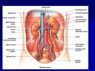 The document provides an overview of renal anatomy and physiology. It describes the key functions of the renal system as filtering waste from the blood and regulating fluid balance. The major structures include the kidneys, which filter blood and produce urine, the ureters which transport urine from the kidneys to the bladder, and the bladder which acts as a reservoir for urine storage. The kidneys contain nephrons, which are the functional filtering units. Blood enters the nephrons via the renal arteries and is filtered in the glomerulus. Urine is produced and drains through the renal tubules and collecting duct system.