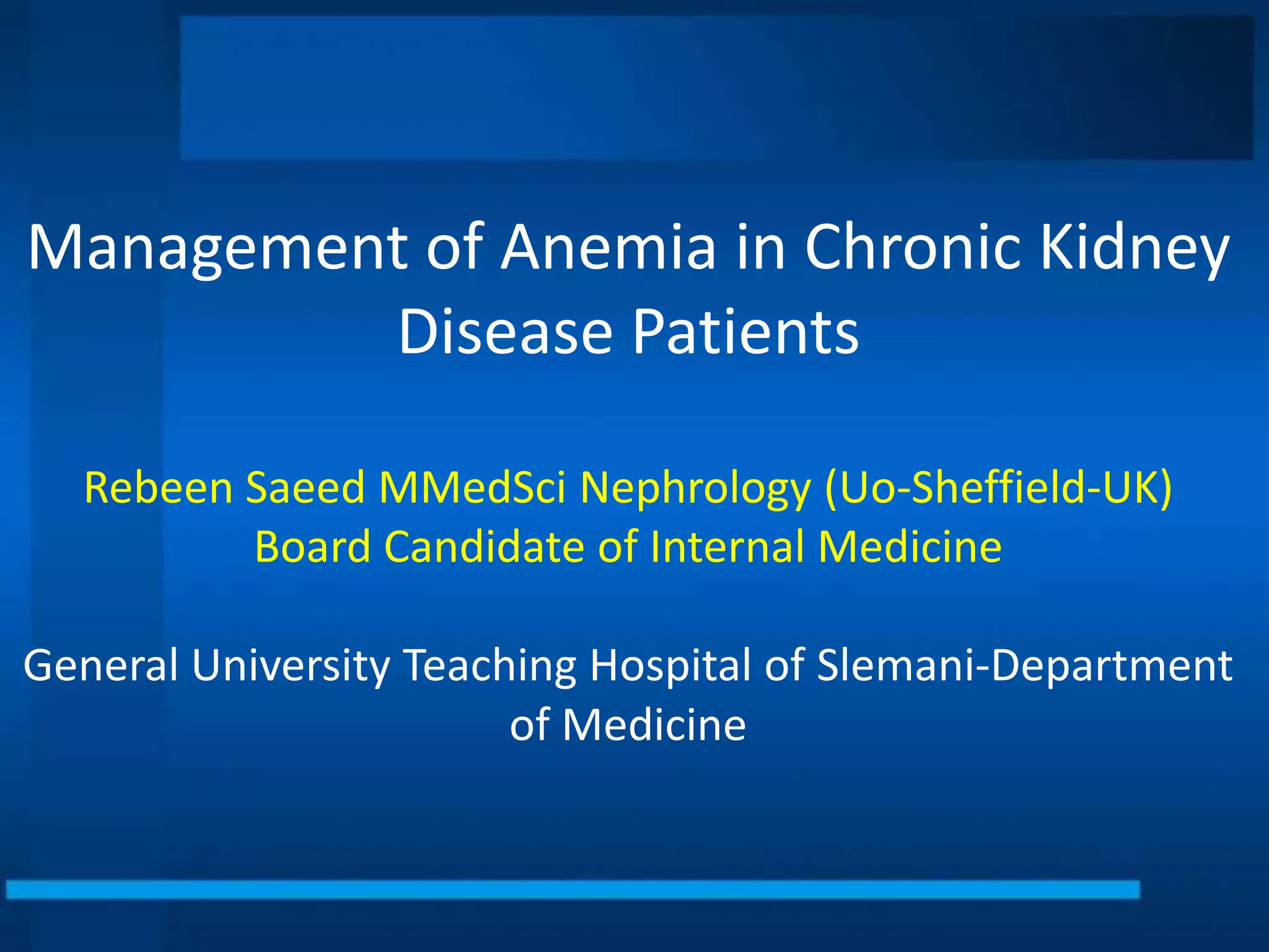 This document provides guidelines for managing anemia in chronic kidney disease patients at General University Teaching Hospital of Slemani. It outlines the historical background of understanding renal anemia and effects of anemia like increased mortality and cardiovascular disease. The guidelines recommend targets for hemoglobin concentration, iron status markers, and schedules for parenteral iron and erythropoiesis-stimulating agent administration and monitoring based on hemoglobin levels and dialysis status. Potential complications and contraindications of treatments are also discussed.