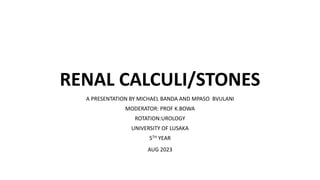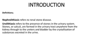 The document presents a comprehensive overview of renal calculi, including definitions, epidemiology, risk factors, and etiology. It categorizes different types of stones, discusses clinical features, diagnostic measures, and treatment options, which include both medical and surgical interventions. The presentation emphasizes the significance of understanding the pathogenesis and prevention strategies for managing urinary stone disease.