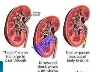 The document discusses urinary tract stones (calculi) including their formation, types, symptoms, diagnosis, and treatment. Key points: