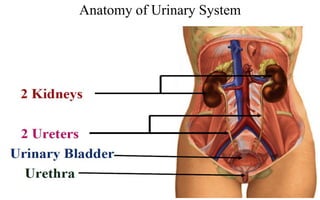 The document discusses renal failure, detailing kidney anatomy, functions, and the definitions of acute and chronic renal failure. It outlines the causes, symptoms, and stages of renal failure, as well as treatment options and prevention strategies. The content emphasizes the importance of maintaining kidney health through proper hydration, weight management, and controlling diabetes and blood pressure.