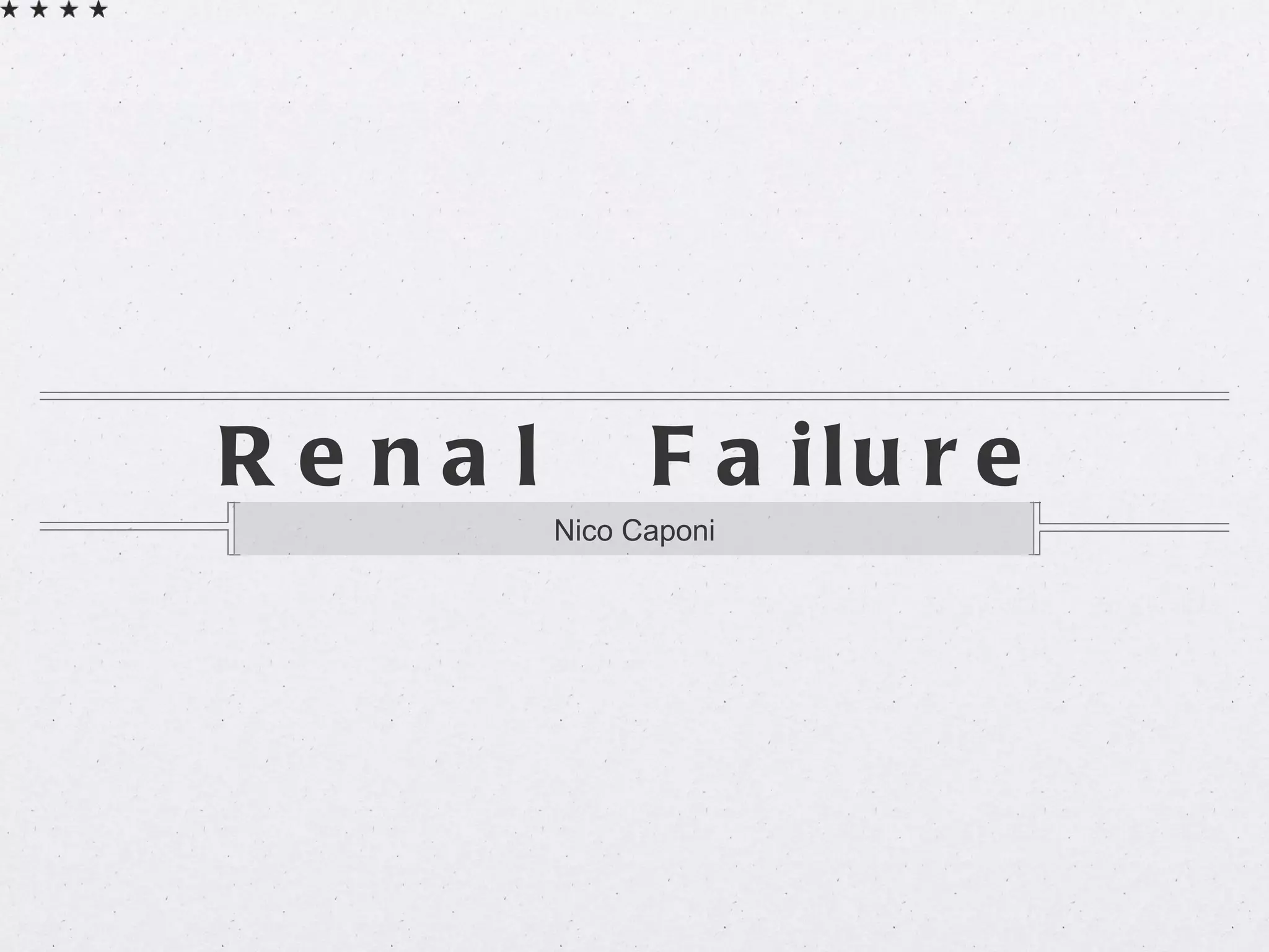 Renal failure, also known as kidney failure, can be acute (AKI) or chronic (CKD). AKI is a rapid loss of kidney function that can be caused by decreased blood flow, kidney damage, or urinary tract obstruction. CKD is a progressive loss of kidney function over months or years that is commonly caused by diabetes, hypertension, or glomerulonephritis. Diagnosis involves measuring glomerular filtration rate and urine/blood tests. Treatment depends on the stage and type of kidney failure, and may include medications, dialysis, or transplant.