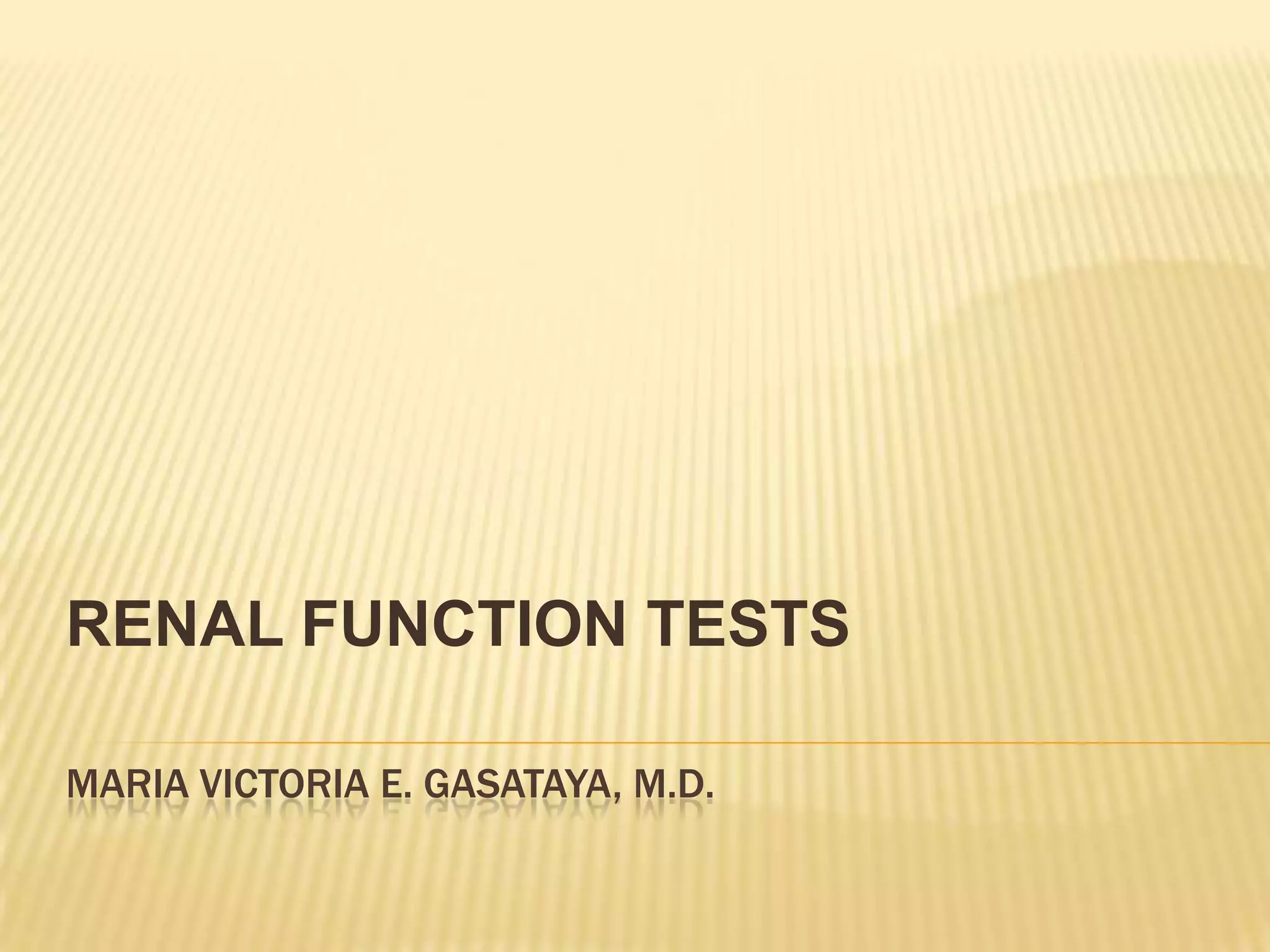 This document discusses various renal function tests used to evaluate different aspects of kidney function. It describes tests of glomerular filtration rate (GFR) including clearance tests using substances like creatinine, inulin, and radioactive tracers. It also discusses tubular function tests like urine concentration tests, osmolarity measurements, and tests of the kidney's response to vasopressin. Formulas for calculating clearance, osmolarity, and free water clearance are provided. The significance of GFR measurements and estimated GFR formulas like Cockcroft-Gault and MDRD are summarized.