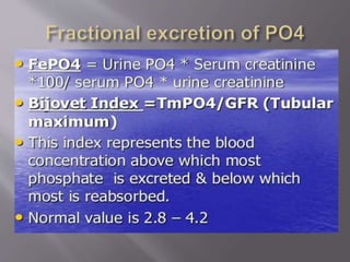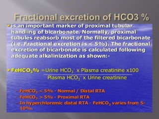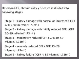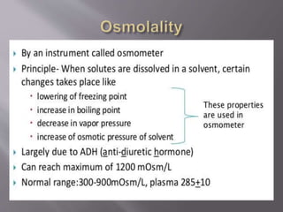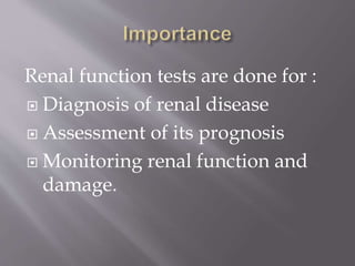 The document discusses renal function tests, their purposes in diagnosing and monitoring kidney health, and describes key parameters such as glomerular filtration rate (GFR) and creatinine clearance. It emphasizes the significance of various substances, including urea, creatinine, and cystatin C, as indicators of renal function, along with the impact of renal diseases on these markers. Additionally, it reviews urine characteristics and abnormalities that can indicate kidney dysfunction, including proteinuria and specific gravity variations.
