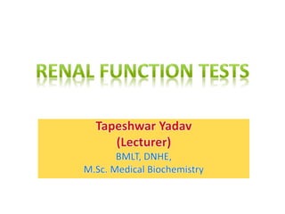 The document discusses various functions of the kidney and renal function tests. The kidney functions include excretion of waste, regulation of salt/water balance, regulation of acid-base balance, and production of hormones. Renal function tests provide information on glomerular function, renal blood flow, and tubular function. Common tests include urine analysis, creatinine clearance tests, urea clearance tests, and inulin clearance tests which help assess glomerular filtration rate and renal function.