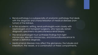 Renal pathology deals with diagnosing and characterizing kidney diseases through examination of renal biopsy specimens using light microscopy, electron microscopy, and immunofluorescence. The renal pathologist must synthesize findings across these diagnostic tools to reach a definitive diagnosis. Medical kidney diseases can affect the glomerulus, tubules and interstitium, blood vessels, or a combination of these renal compartments.
