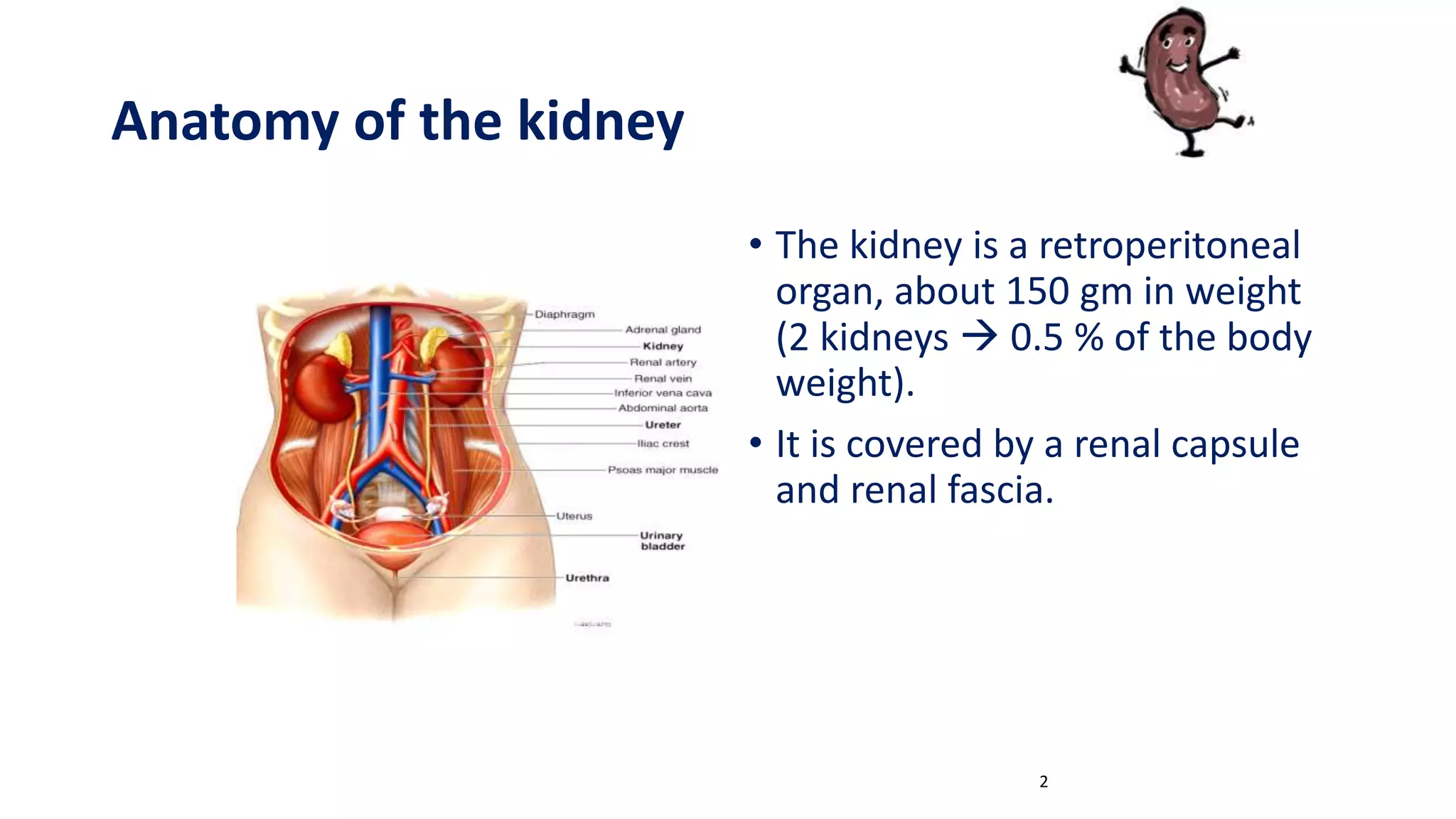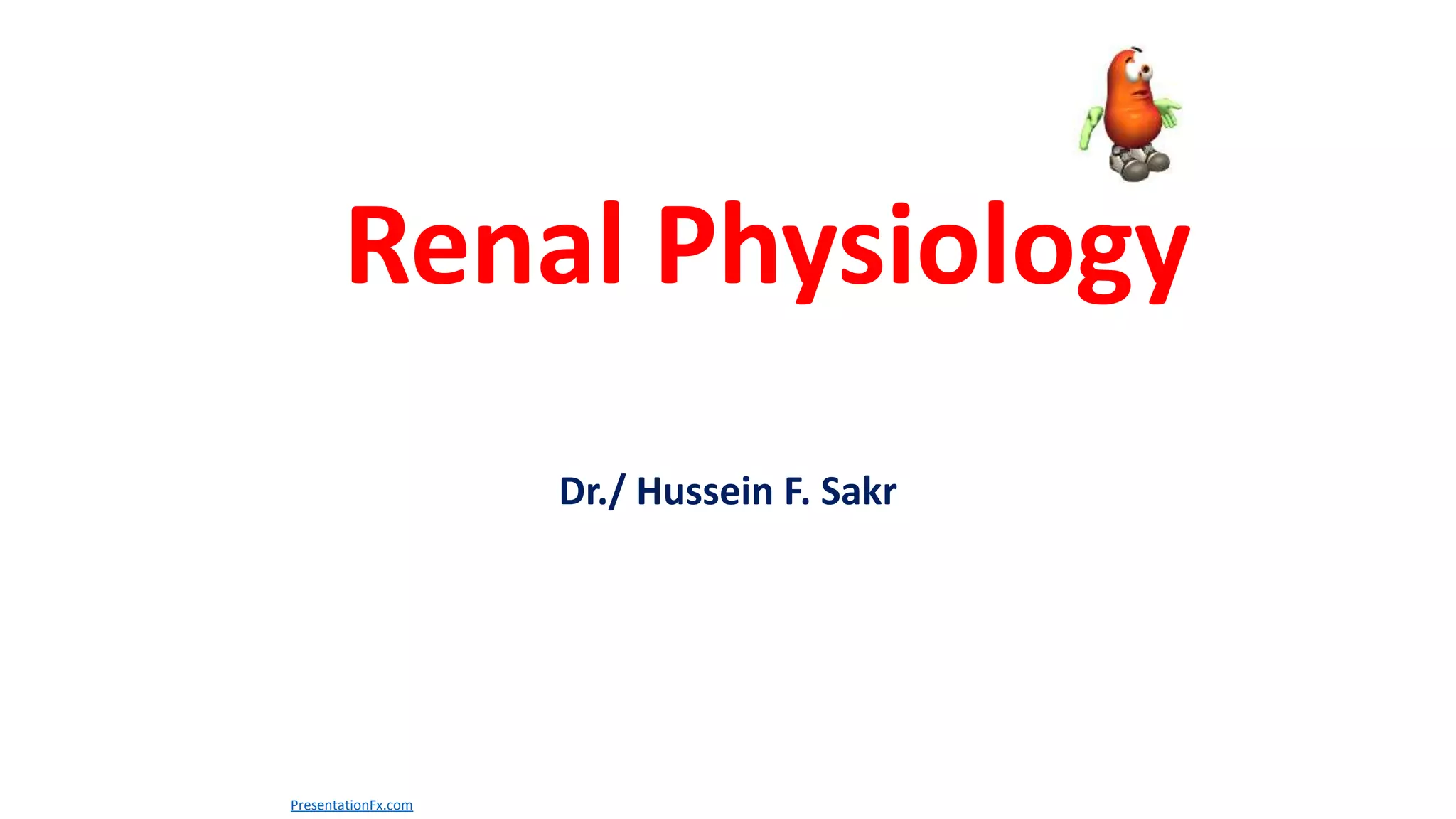 The document provides an overview of renal physiology, including the anatomy, structure, function, and blood supply of the kidney. It describes the nephron as the functional unit of the kidney, composed of the renal corpuscle and renal tubules. There are two main types of nephrons - superficial cortical nephrons and juxtamedullary nephrons. The document also discusses the juxtaglomerular apparatus, which regulates renin release in response to changes in sodium concentration or blood pressure. Renin triggers the renin-angiotensin-aldosterone system, which functions to retain salt and water and constrict blood vessels.