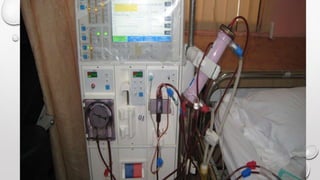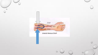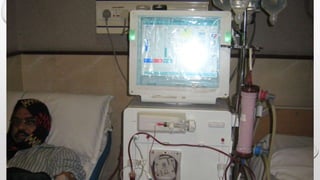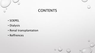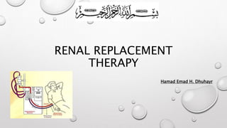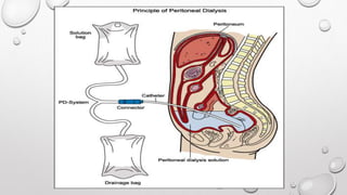 This document discusses renal replacement therapy options for patients with kidney failure, including dialysis and transplantation. It provides details on the two main types of dialysis: peritoneal dialysis, which uses the peritoneal membrane as a filter, and hemodialysis, which uses an artificial kidney to filter blood outside the body. Kidney transplantation is also covered, noting it requires patients first be on dialysis and listing the surgical procedure and common complications.