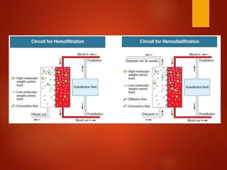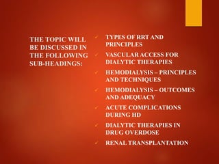 This document discusses various topics related to renal replacement therapy including: