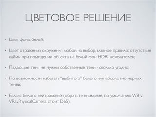 Документ содержит требования к художественным и техническим аспектам рендеринга объектов, включая цветовое решение и технические спецификации. Необходимо выполнить три рендера с конкретными углами, используя разрешение не менее 1000 px, и определенные форматы файлов. Также предоставлены рекомендации по использованию программного обеспечения и примеры правильных рендеров.