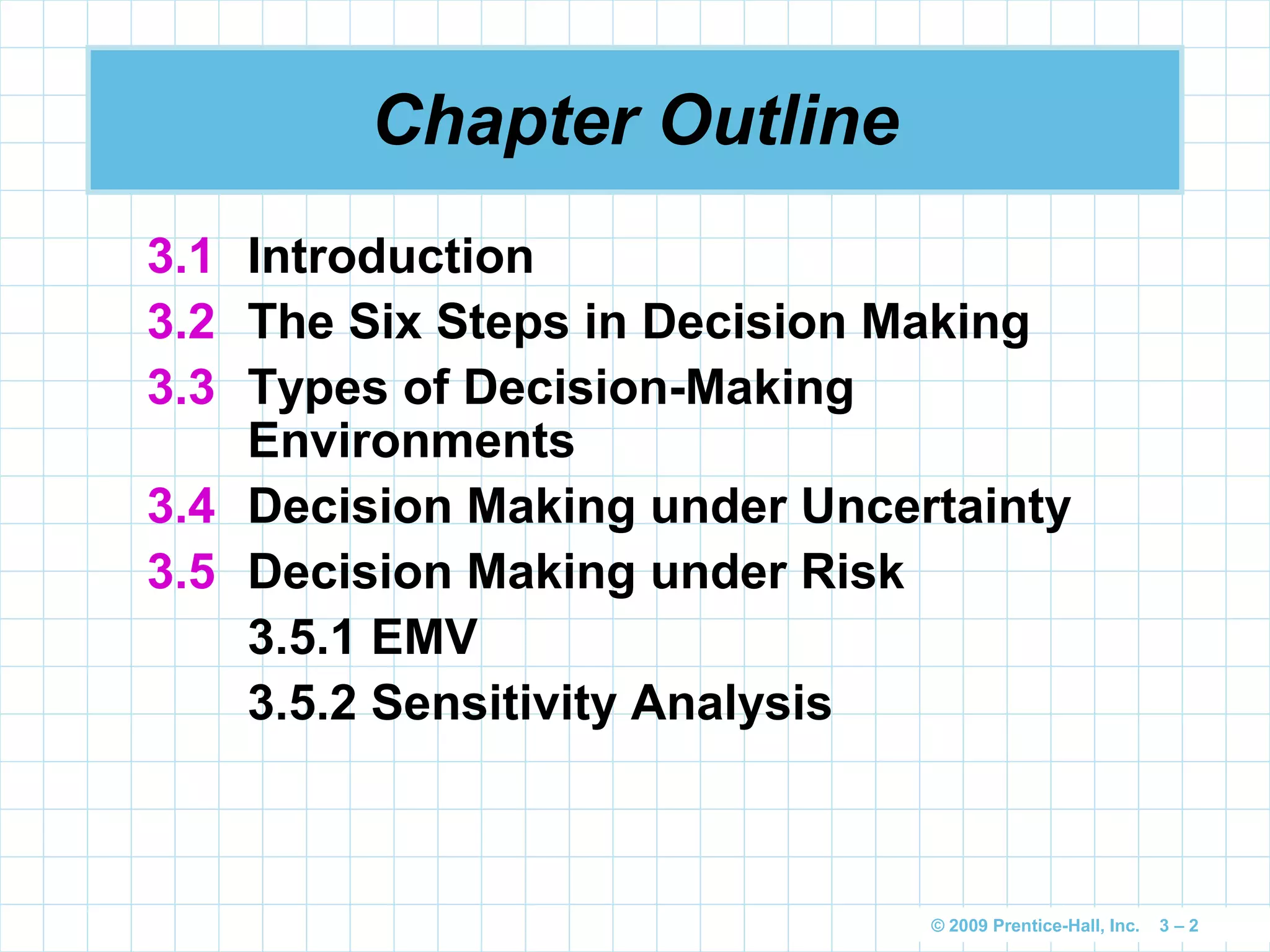 This document outlines concepts related to decision making under uncertainty and risk. It discusses six steps to decision making, including defining the problem, listing alternatives and outcomes, and identifying payoffs. It then covers various decision making models for uncertainty, like maximax, maximin, and expected monetary value. Sensitivity analysis is introduced as a way to examine how decisions may change with different input data. The document uses examples and tables to illustrate key concepts in decision analysis.