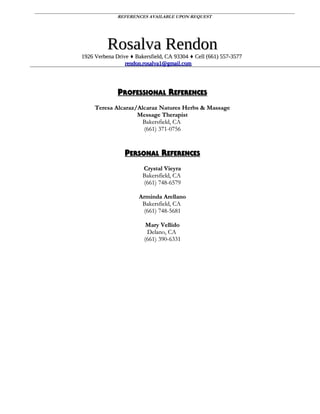 Rosalva Rendon is seeking a position that utilizes her strong organizational, customer service, and communication skills. She has over 2 years of experience in customer service fields including as a retail salesperson, stock clerk, and providing customer service. She is bilingual in English and Spanish. Her resume lists qualifications, skills, work history including positions at Old Navy and Toys R Us, education including certification as a massage therapist, and professional and personal references.