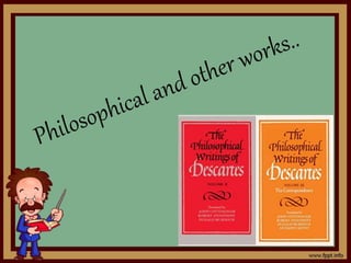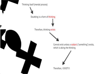 René Descartes was a French philosopher, mathematician, and scientist born in 1596. He is known as the "father of modern western philosophy" and developed analytical geometry, bridging algebra and geometry. Descartes doubted all knowledge that was uncertain and developed his famous saying "I think, therefore I am" to establish certainty. He created a systematic method of doubt and reasoning to develop knowledge, establishing rationalism as a means to derive truth through reasoning alone rather than experience. His works had significant influence on the development of modern mathematics, philosophy, and science.