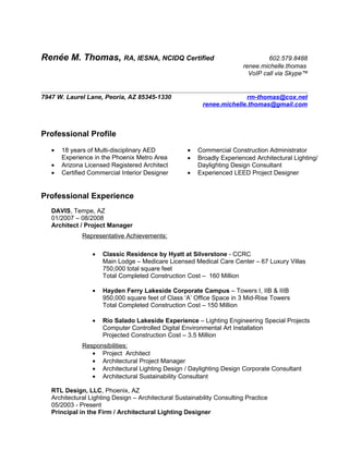 Renée M. Thomas is an architect, interior designer, and lighting designer with over 18 years of experience in commercial construction in the Phoenix metro area. She has managed projects totaling over $300 million, including multi-building corporate campuses, medical facilities, and civic projects. Some highlights include designing a LEED Platinum applied science lab and business school for Northern Arizona University. She currently works as a principal at her own firm, providing architectural lighting design and sustainability consulting services.
