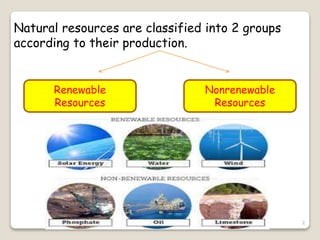 This document classifies natural resources as either renewable or nonrenewable. Renewable resources, such as trees, plants, animals, water, sunlight and wind can be replenished naturally or through human efforts. Nonrenewable resources like coal, oil, natural gas, gold, silver and iron exist in finite amounts and get depleted once extracted from the earth. The document provides examples of renewable and nonrenewable resources and asks the reader to classify additional resources into the two categories.