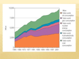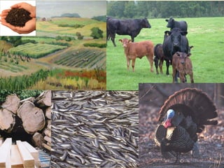 This document discusses the classification and types of natural resources. It separates resources into renewable and non-renewable categories. Renewable resources like water, crops, and wind can regenerate within a human lifetime. Non-renewable resources such as coal, oil, and minerals take millions of years to form and exist in fixed amounts. The document also covers alternative energy sources like solar, wind, hydropower, and nuclear power. Overall resource availability depends on the costs of extraction and processing.