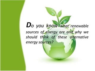The document discusses the importance of renewable energy sources, highlighting the environmental damage caused by non-renewable sources like fossil fuels. It covers various renewable energy types, such as solar, wind, biomass, geothermal, and hydroelectric, while explaining their benefits in reducing pollution and providing sustainable energy. Additionally, it presents a successful case study of Ralegaon Siddhi, a village that has implemented renewable energy solutions to improve its sustainability and self-sufficiency.