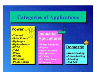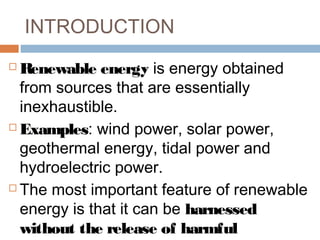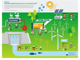 This document summarizes renewable energy sources. It discusses various renewable sources like wind, solar, hydroelectric, tidal, and geothermal energy. It provides information on non-renewable sources like coal, LPG, natural gas and nuclear energy. It also shares data on energy consumption per capita in different countries and the share of different energy sources in India's total power generation. The document further describes various solar energy applications like solar panels, solar collectors, solar street lights and their merits and limitations. It concludes with providing facts about other renewable sources like hydroelectric, biomass, biogas, ethanol and hydrogen energy.