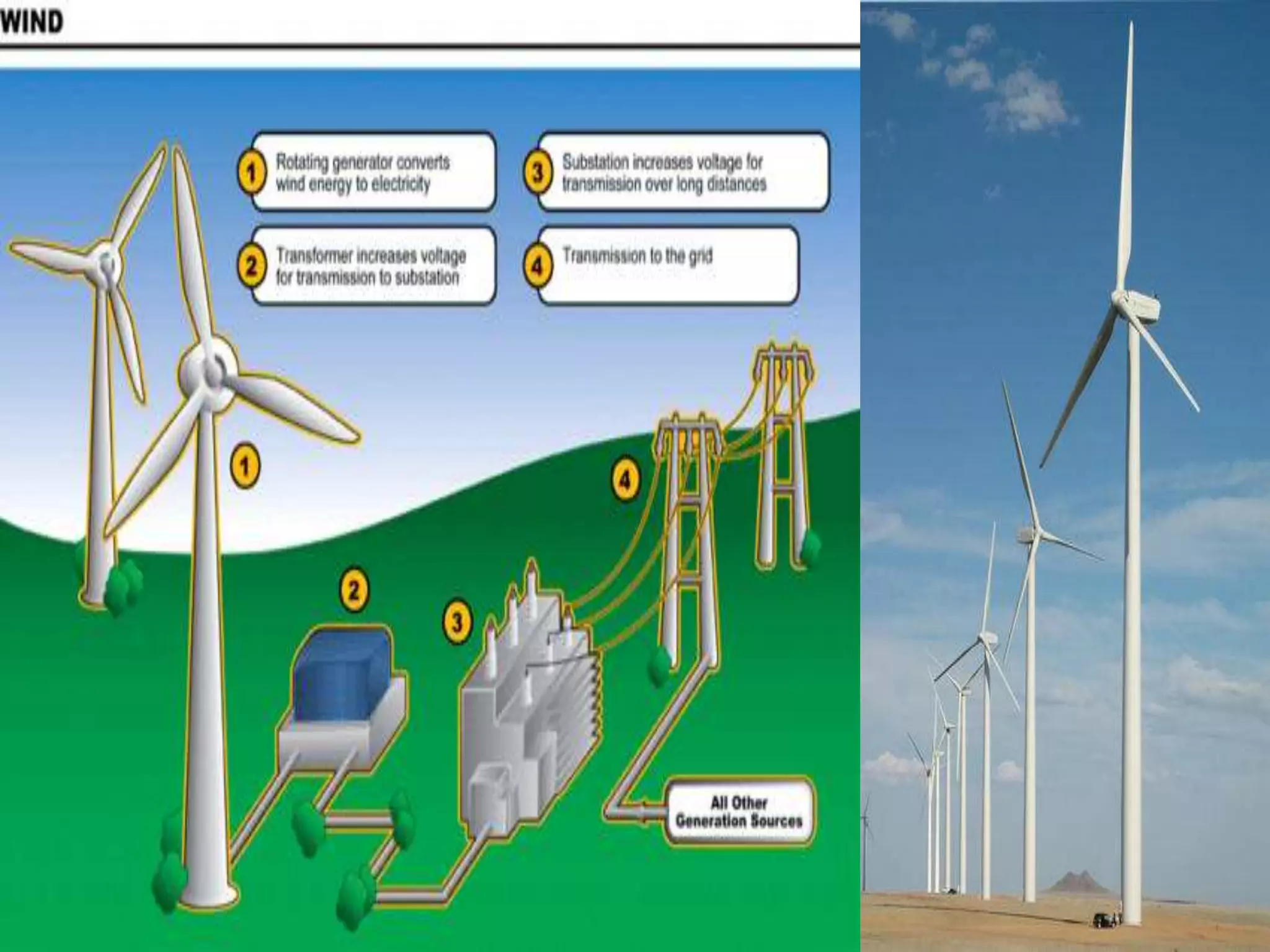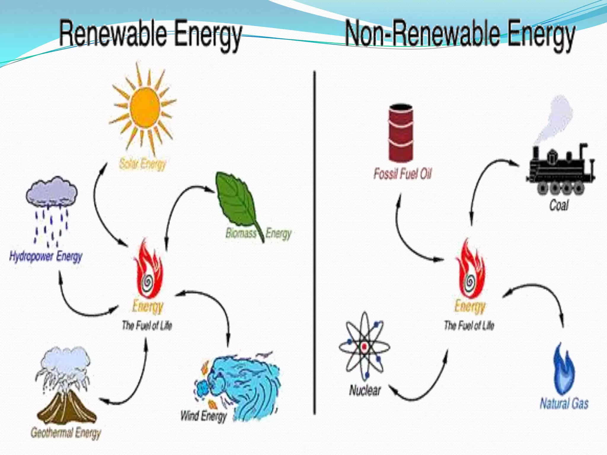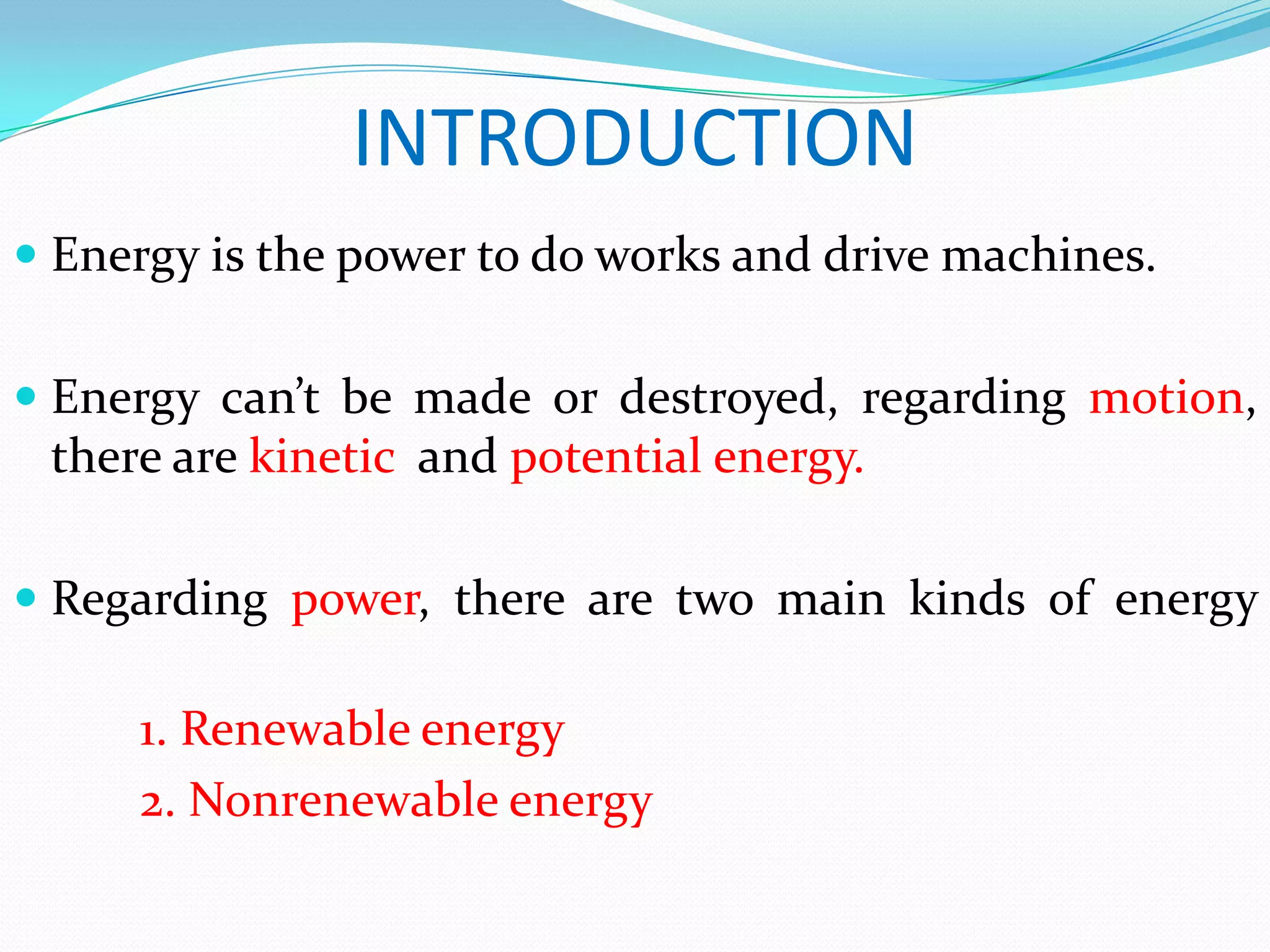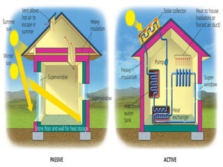 This document discusses various types of renewable energy sources including solar, wind, geothermal, hydro, and tidal energy. It provides details on solar energy and how photovoltaic panels work to convert sunlight directly into electricity via the photovoltaic effect. It also describes thin film solar cell technology and the process used to deposit materials to form solar panels. Additionally, it briefly touches on other renewable technologies like wind turbines, nuclear energy, and harvesting energy from natural resources and the environment. The document outlines some advantages and disadvantages of different energy sources.