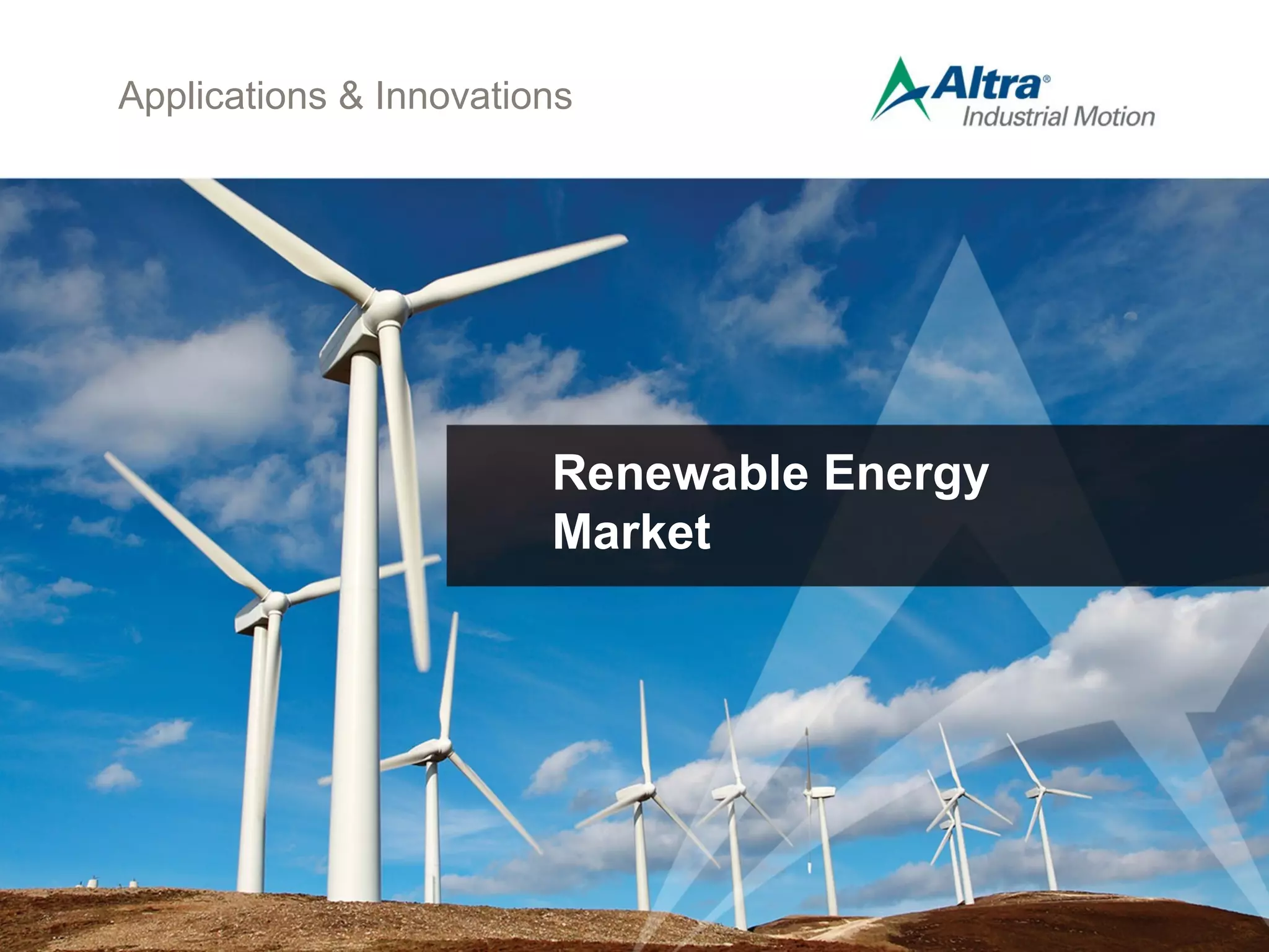Altra Industrial Motion provides a range of drivetrain products essential for renewable energy applications including wind, solar, and biomass technologies. Their engineering teams collaborate with major OEMs to deliver custom solutions such as caliper brakes, couplings, and actuators, addressing specific challenges like limited space and performance optimization. The document outlines various case studies where Altra's solutions, including hydraulic brakes and cooling systems, have significantly improved the efficiency and reliability of renewable energy systems.
