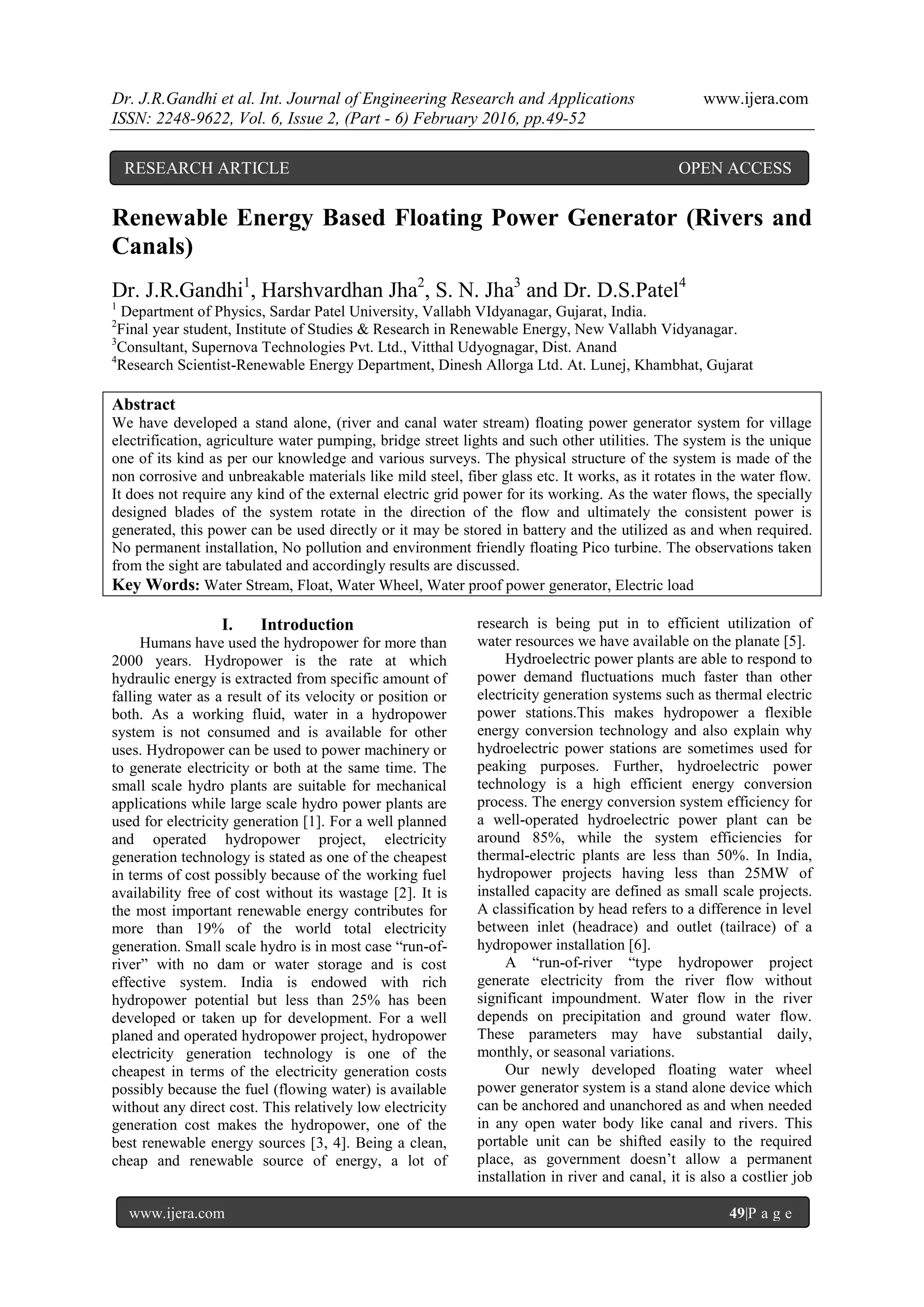 1) Researchers in India have developed a floating power generator system that can generate electricity from flowing water in rivers and canals without needing to be permanently installed.