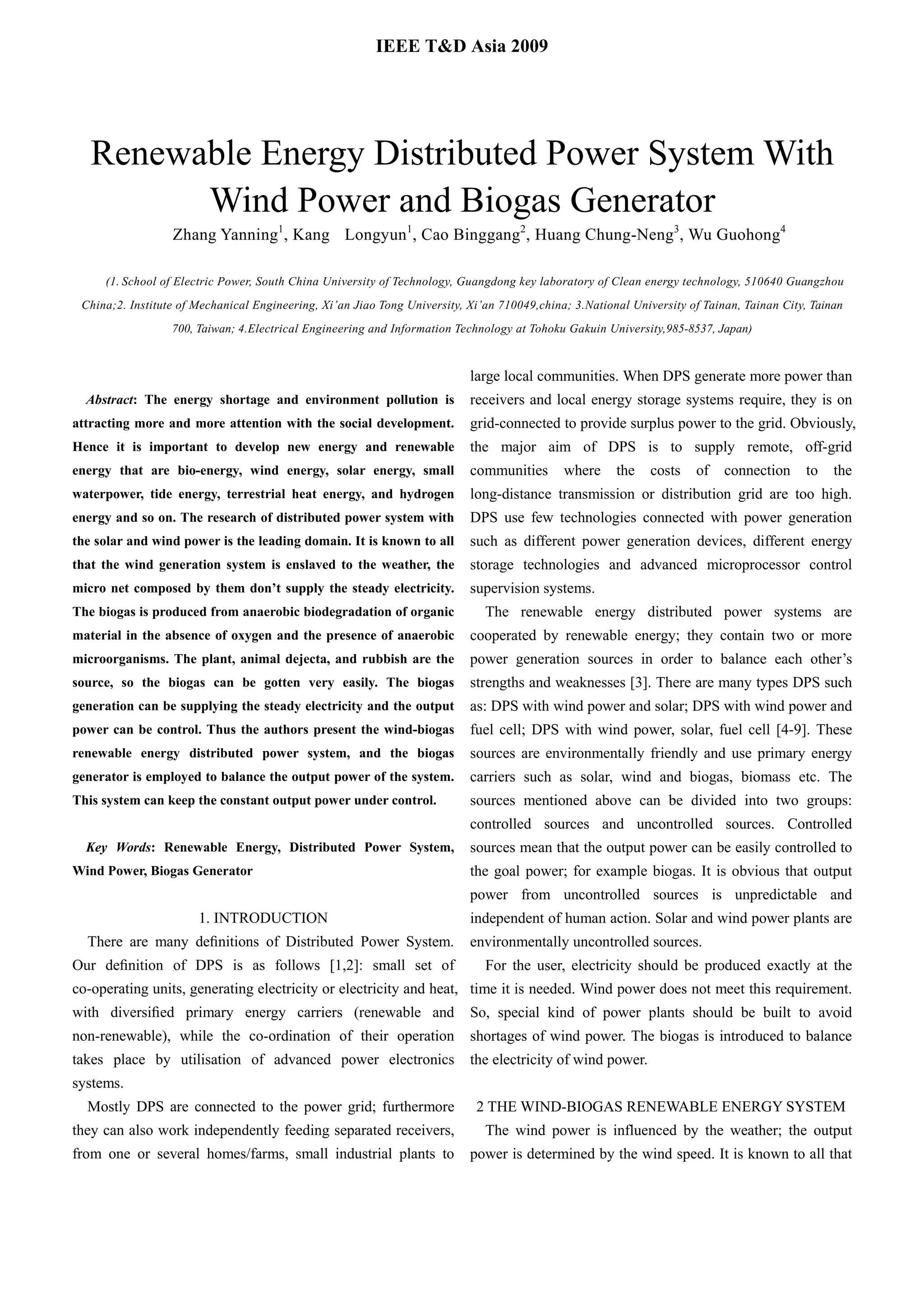 This document summarizes a distributed power system with wind power and biogas generation presented at the IEEE T&D Asia 2009 conference. The system aims to provide steady electricity to remote communities using renewable energy sources. It combines an uncontrolled wind power generator with a controlled biogas generator to balance the intermittent wind output. The biogas generation allows controlling the system's total power output to meet electricity demand. Power flow and the sizing of the biogas capacity to stabilize output are discussed.