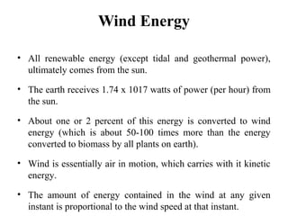 Wind energy is derived from the sun's power, with wind being the result of atmospheric motion. Wind turbines convert wind's kinetic energy into electricity, influenced by wind speed and air density, with vertical axis turbines having advantages and disadvantages in design and performance. Despite high initial costs and noise, wind power is increasingly viable due to its availability and lack of carbon emissions.