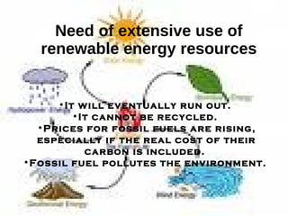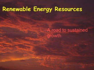 The document discusses various renewable energy resources that can provide sustained growth including solar, wind, biomass, hydro, and tidal energy. It notes that fossil fuels are finite and cause pollution, while renewable resources are abundant in India. The government has implemented strategies to promote use of renewables such as solar water heaters and wind farms through various policies and initiatives.