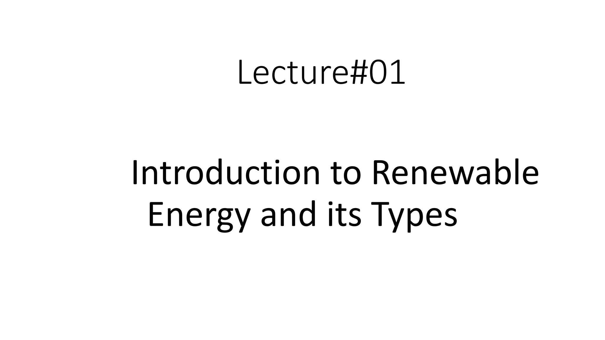This lecture introduces renewable energy sources and their importance for Pakistan. It aims to help students understand different renewable resources like wind, solar, tidal, and geothermal energy as well as biofuels and hydro energy. The lecture distinguishes renewable sources that replenish naturally from non-renewable resources and highlights exploring renewable alternatives to conventional energy to benefit Pakistan through managing renewable sources and their applications.
