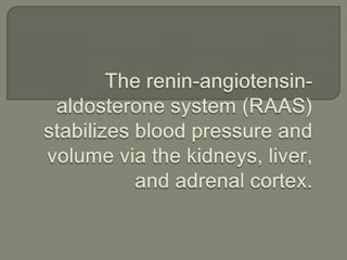 This document summarizes several components of the renin-angiotensin system and their roles in regulating blood pressure. It explains that renin is released by the kidneys and converts angiotensinogen to angiotensin I. Angiotensin I is then converted to angiotensin II by ACE, causing vasoconstriction and increased blood pressure. Angiotensin II stimulates the release of aldosterone and ADH, maintaining sodium and water levels in the blood. The atrial natriuretic peptide functions to lower blood pressure as a vasodilator that prevents sodium reabsorption.