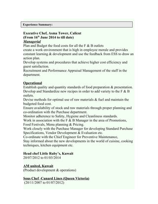 This document is a resume for Renjith Suresh Babu. It summarizes his work experience as an Executive Chef in India and the Middle East over the past 15 years. It also lists his skills, qualifications, and references. Renjith is seeking a position that allows him to utilize his experience in food and beverage operations, menu planning, recipe development, and staff management.