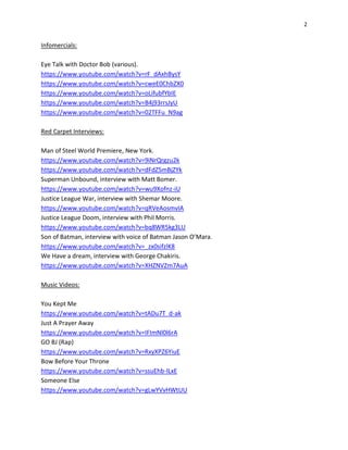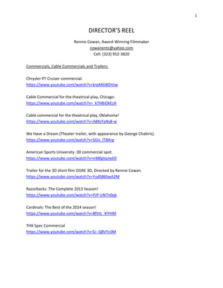 The document is a director's reel for Rennie Cowan, an award-winning filmmaker. It provides links to over 30 of Cowan's commercials, trailers, infomercials, music videos, and other works spanning from 1998 to 2014. The reel highlights Cowan's experience directing projects for Chrysler, Broadway plays, sports organizations, animation, and more. It also lists several awards Cowan has received for excellence in cinematography, videography, and from the California State Legislature and Chapman University.