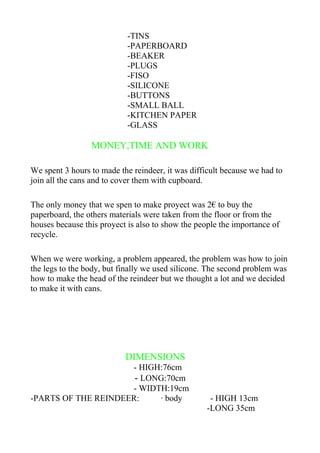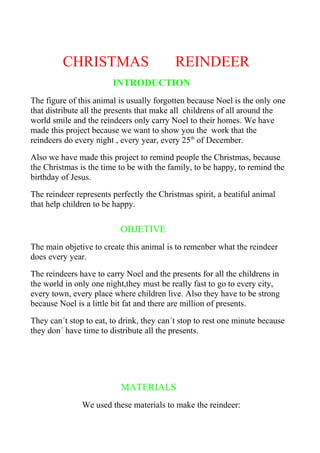 The document discusses a school project to create a reindeer model out of recycled materials to teach about the reindeer's role in Christmas. The main objectives were to remember what reindeer do every Christmas Eve and highlight their importance in helping Santa deliver presents around the world in just one night. The students spent 3 hours making the 76cm tall reindeer model out of cans, paperboard, and other materials. They were pleased with the results of their project and happy they could highlight recycling.