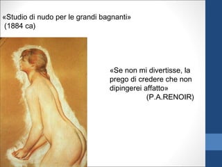 Il documento analizza le opere di Pierre-Auguste Renoir, evidenziando il suo approccio al nudo e ai soggetti sociali come le coppie danzanti e la vita quotidiana. Vengono menzionate specifiche opere come 'La colazione dei canottieri' e 'Bagnante seduta', mettendo in luce dettagli tecnici e l'uso della luce. Inoltre, si citano opinioni di altri artisti, come Pissarro, sui metodi e le scelte stilistiche di Renoir.