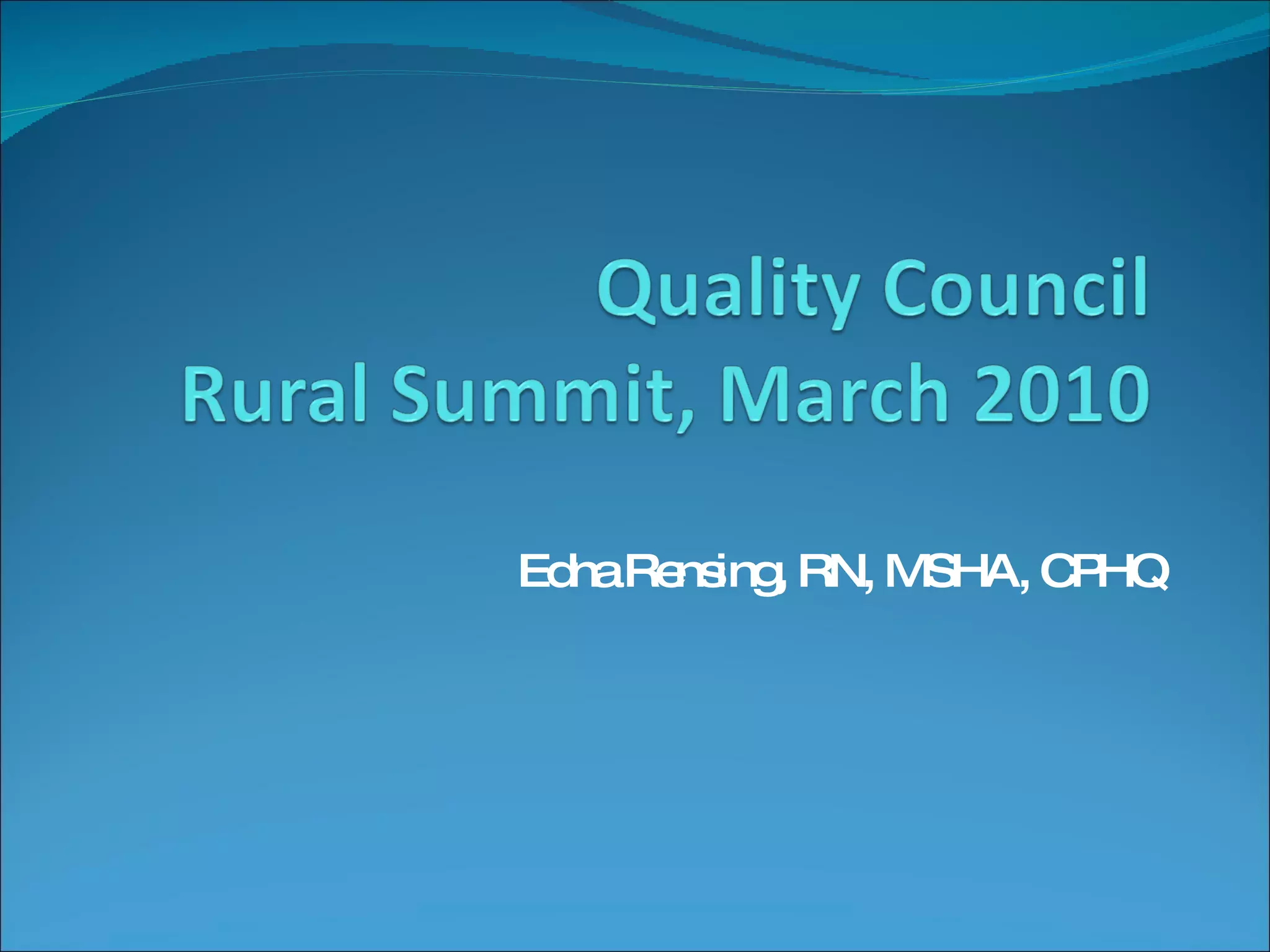 The document discusses quality improvement in rural healthcare settings in Virginia. It recommends establishing a Rural Health Performance and Quality Advisory Council to support quality improvement efforts. Several databases and quality measures are mentioned that could help measure progress, identify health inequities, and increase transparency of quality data. The document also discusses survey results showing areas for improvement in rural hospitals, such as staffing, handoffs, and nonpunitive responses to errors. It proposes expanding membership of the Advisory Council to include more stakeholders and continue planning quality improvement initiatives.