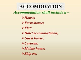 This document discusses rent free accommodation provided by employers and its taxation. It defines rent free accommodation and provides rules for valuation of unfurnished, furnished and accommodation provided at concessional rent. For unfurnished accommodation, taxable value is a percentage of salary based on city population size. Furnished accommodation value includes furniture costs. Concessional rent value is the difference between market rent and amount paid. Exceptions for certain government employees are also outlined.