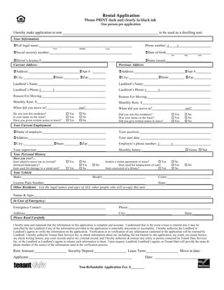 This document is a rental application form for a prospective tenant to fill out. It requests personal information such as name, address, social security number, employment details, and rental history. It also asks if the applicant has ever been evicted, broken a lease, declared bankruptcy, or been convicted of a felony. The applicant must provide references for current and previous landlords and authorize a background check. Finally, it specifies the proposed rent amount, security deposit, lease terms, and move-in date.