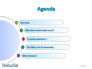 Testwise provides testing equipment rental and professional services to reduce costs and risks for clients. Rental makes sense when clients have short-term needs, tight budgets, or want to avoid large capital expenses. While rental has costs, it eliminates expenses associated with equipment ownership like depreciation, maintenance, storage, and disposal. Rental also ensures clients always have the latest equipment without technology becoming obsolete.